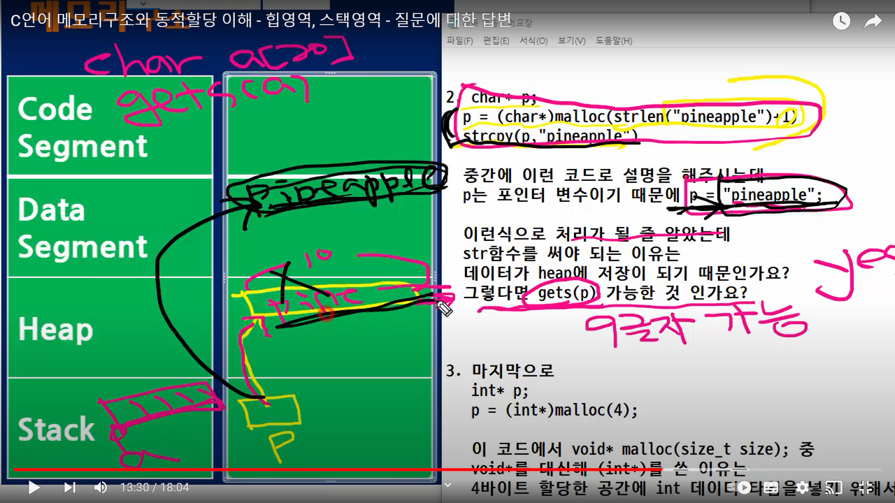 <출처 : 양주종의 코딩스쿨 채널 C언어 메모리구조와 동적할당 이해 - 힙영역, 스택영역 - 질문에 대한 답변>