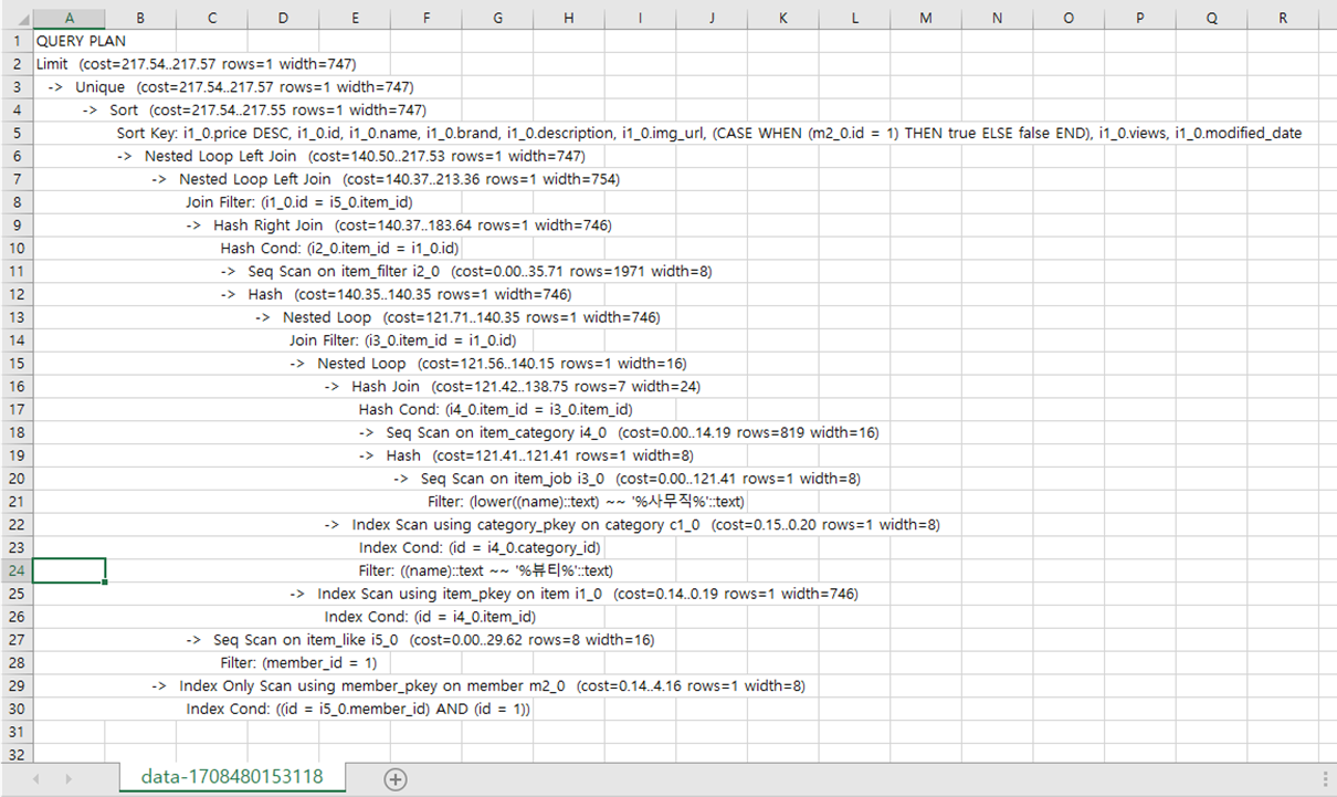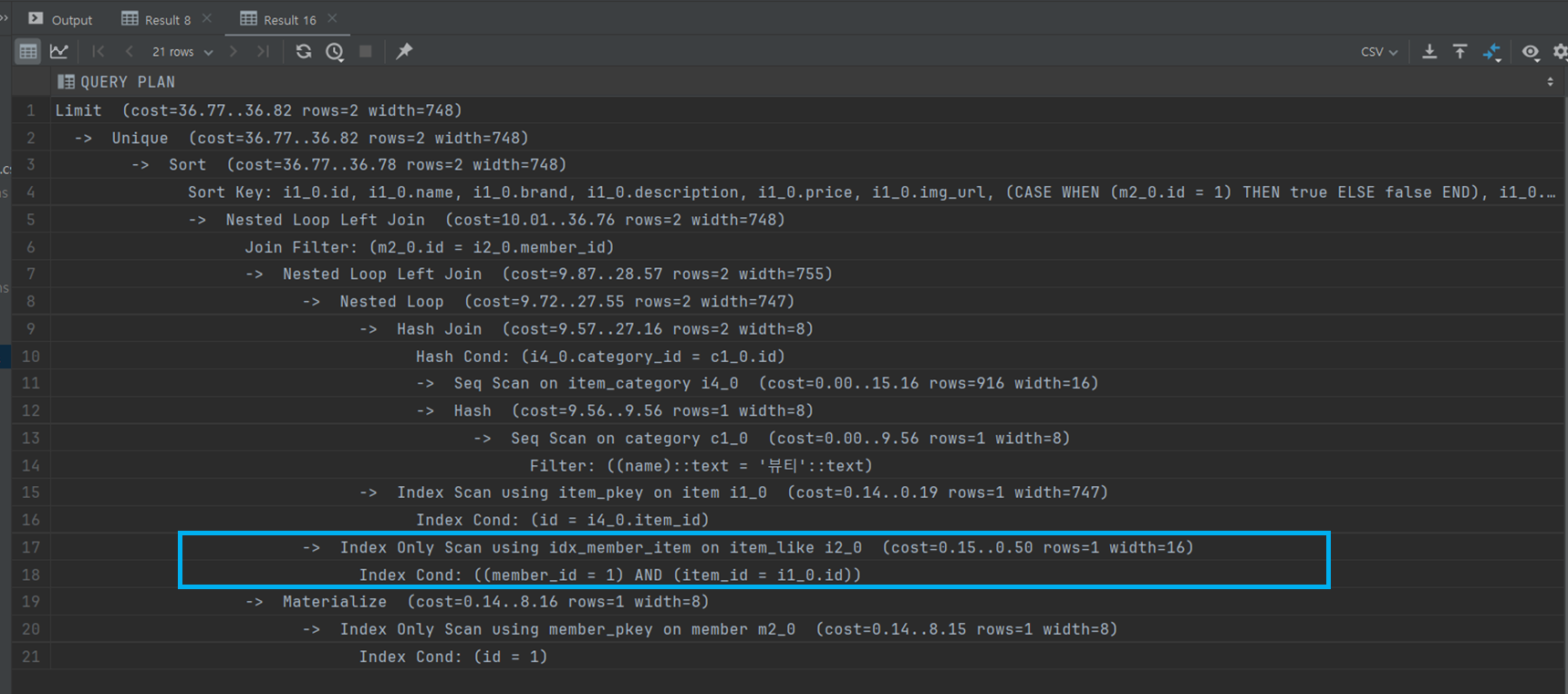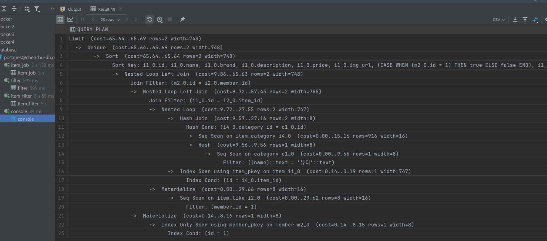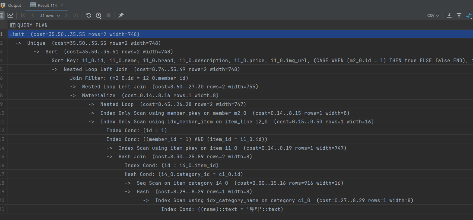 - Item_like 테이블과 category 테이블에서 Seq Scan 발생 -> 인덱스가 적절하게 사용되지 않고 있다는 것을 의미