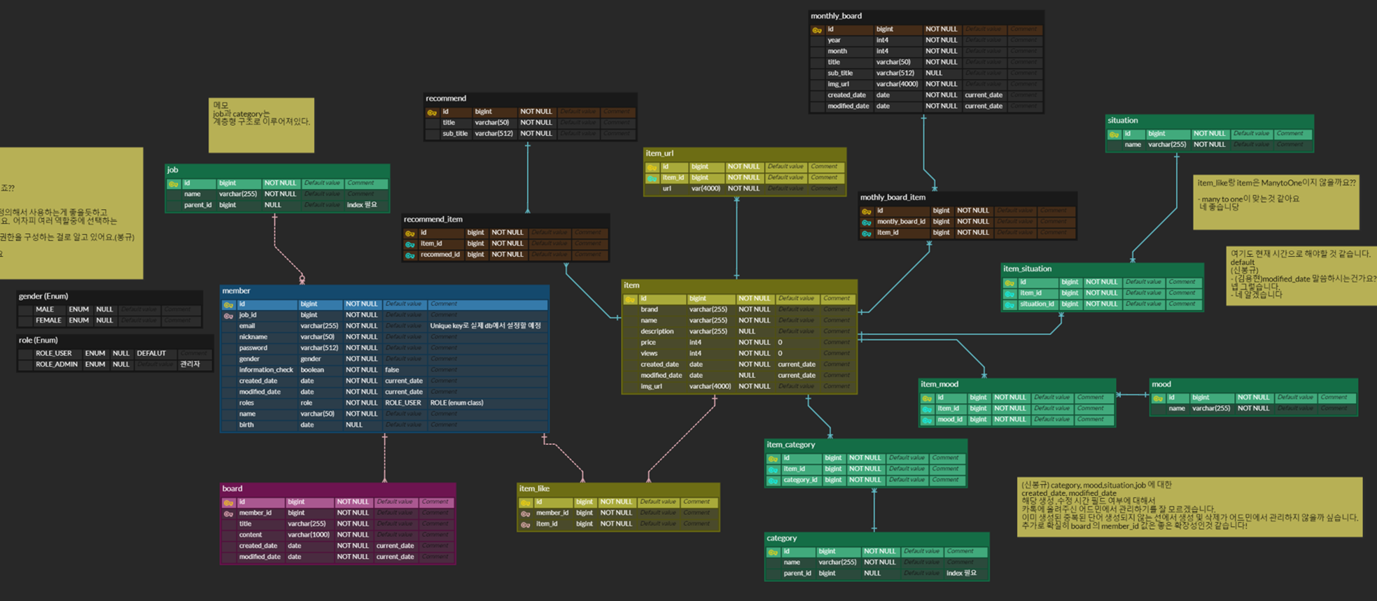 개인 맞춤형 선물 큐레이션 서비스 웹사이트였기 때문에 (카카오톡 선물하기와 비슷한 도메인) item 을 중심으로 keyword와 filtering을 할 수 있는 관계형 데이터베이스 구조입니다.