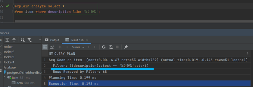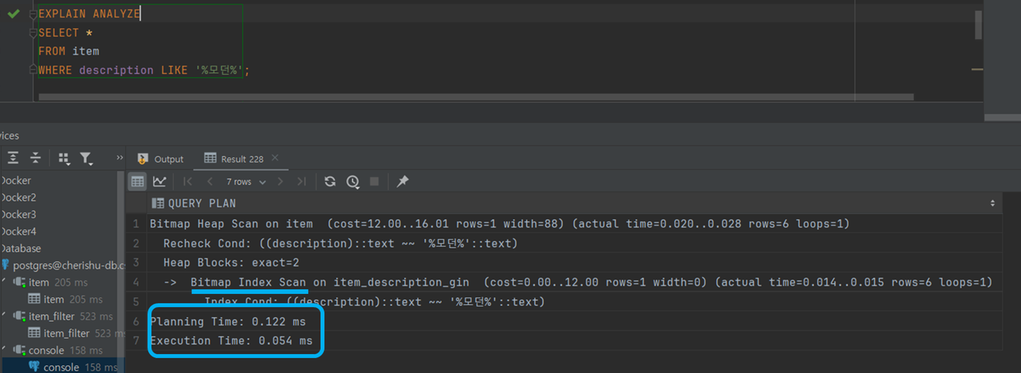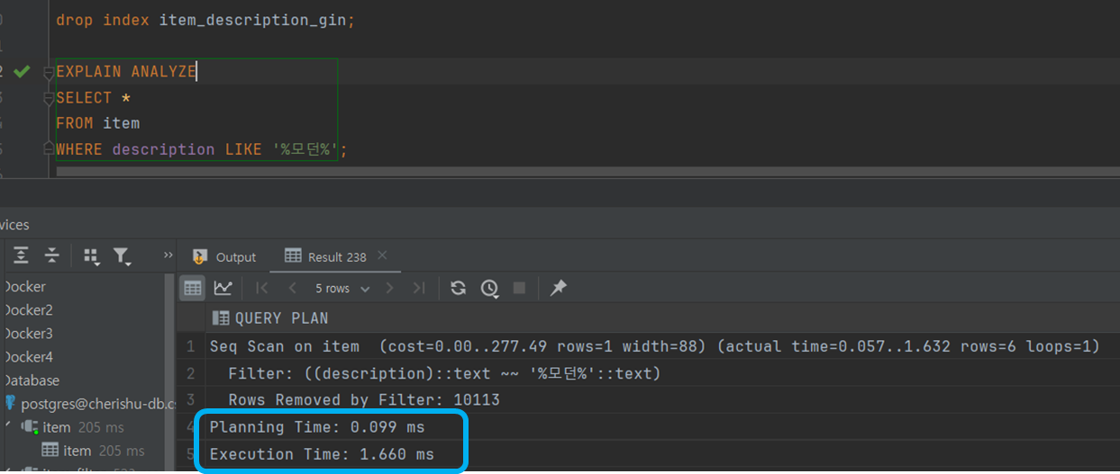 아마 Item 테이블에 충분한 데이터 row가 없어서 gin index를 활용하는 것이 효율적이지 않는 것 같습니다.