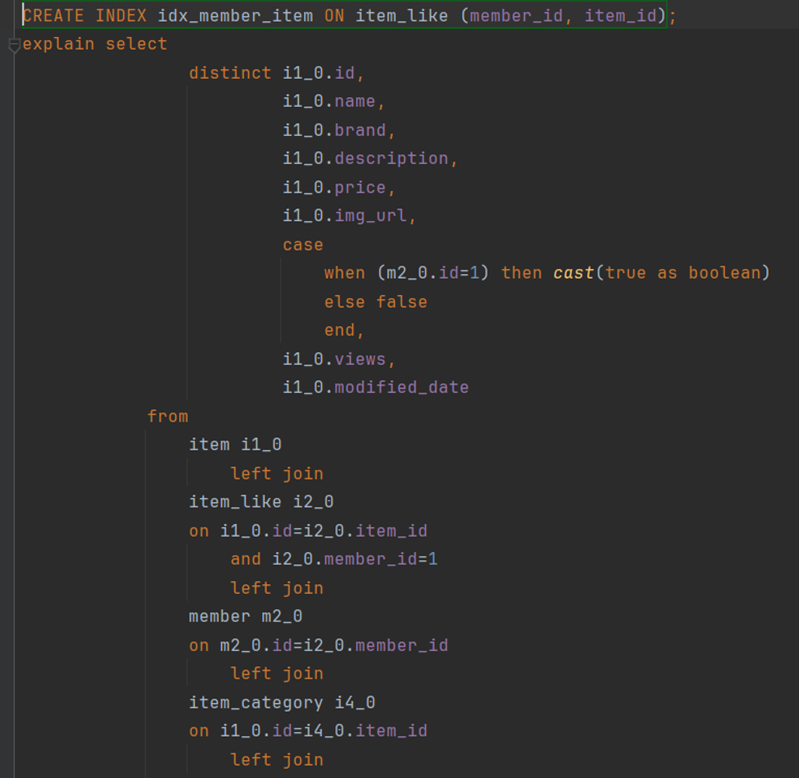 - Item_like 테이블에서 (item_id, member_id) 복합 인덱스를 생성해서 Item_like 테이블의 조인 조건에서 사용되는 필드들에 대한 인덱스를 추가하여 성능 개선을 해보겠습니다.