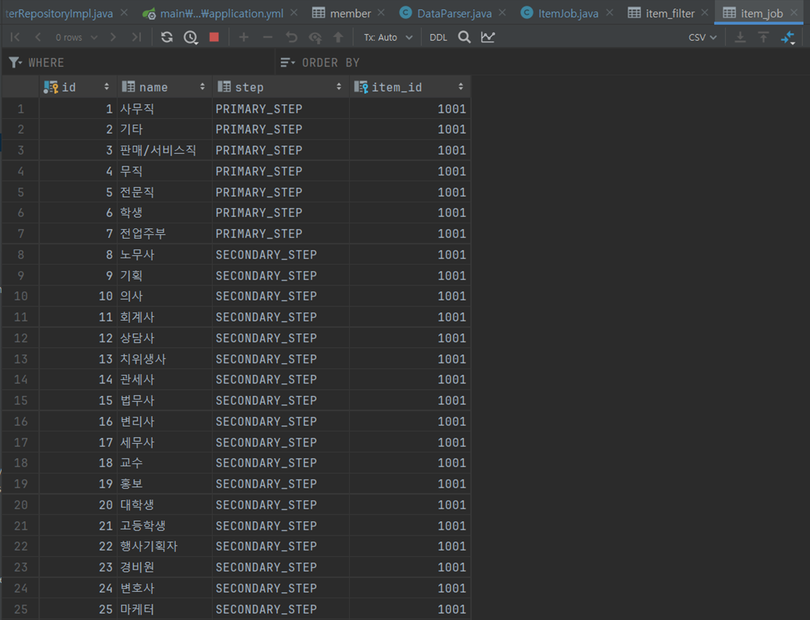 @Profile("put-data")의 DataParser class를 만들어 알맞은 table column 에 insert 해줬습니다.