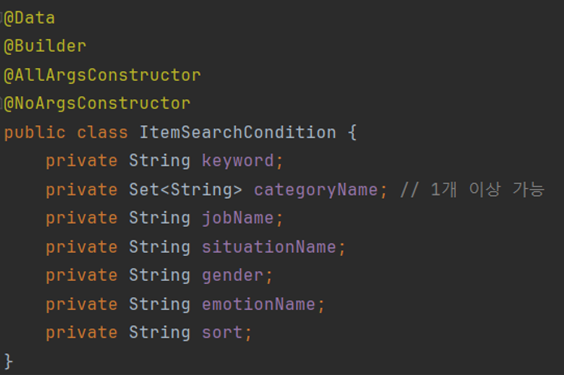 ItemSearchCondition 에서 받는 requestParam 들은 위와 같이 지정된 itemFilter 명이 있어서 like 대신 equals = 로 판단하면 되기 때문에 category name 에 index를 거는게 효율적라는 판단이 들었지만,