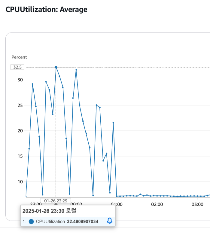 총 7번의 부하테스트를 진행해봤는데 최대 32.5%로 60%를 목표로 진행했던 부하테스트보다 훨씬 무리가 덜 갔다.