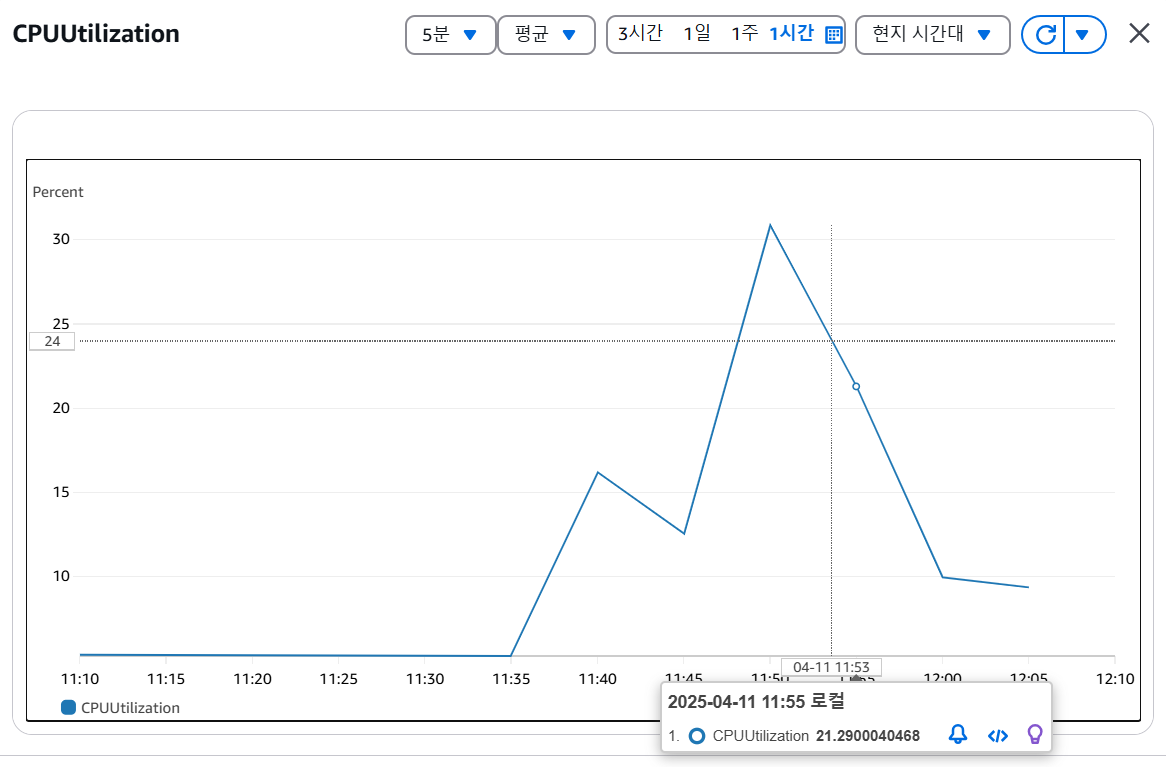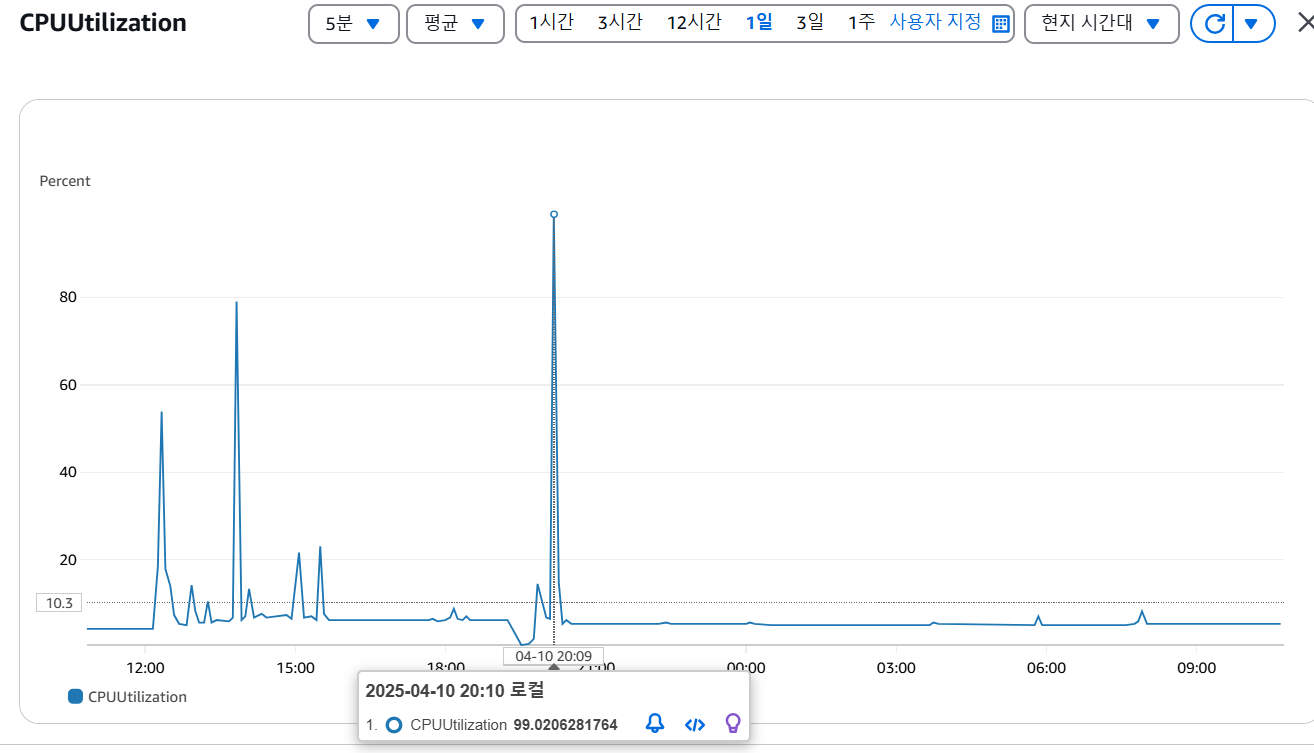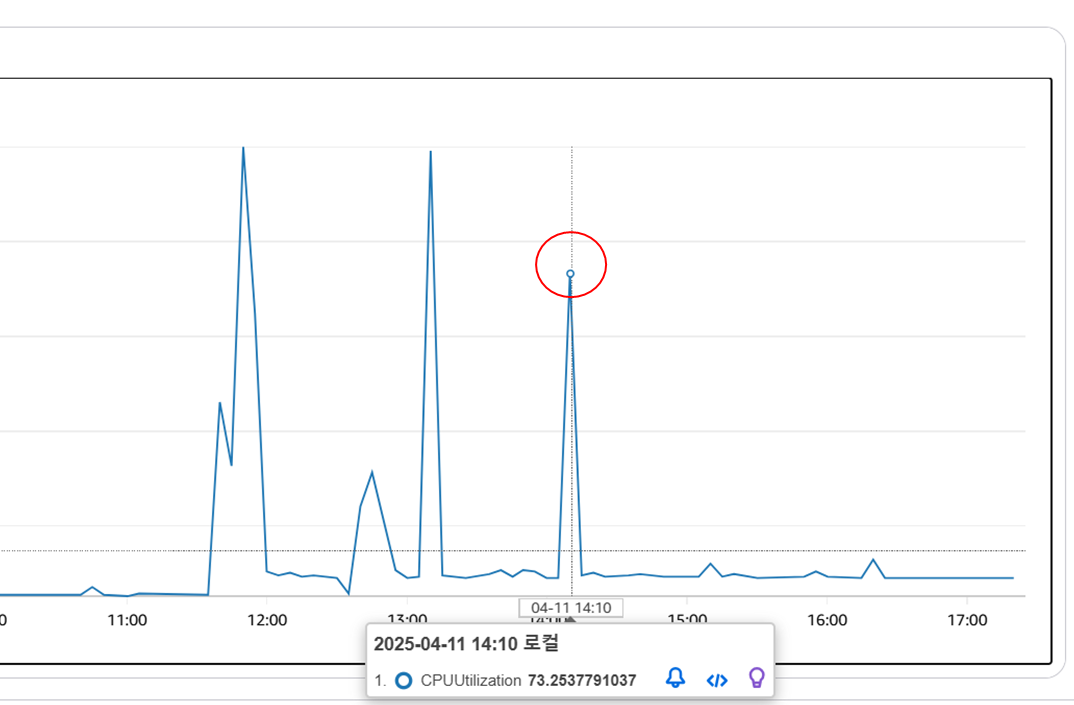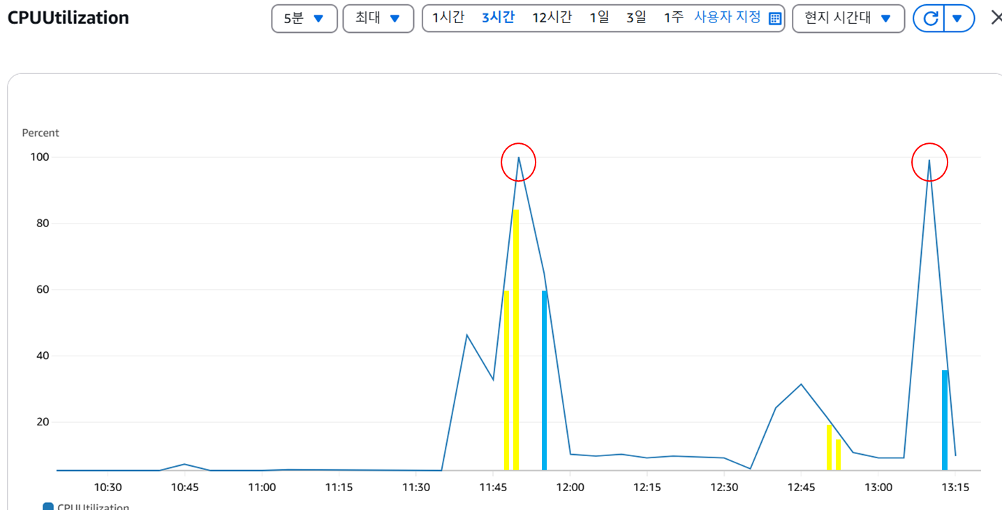 CPU 최대 사용량 지표에서 반복되는 스파이크 현상이 나타났습니다.
