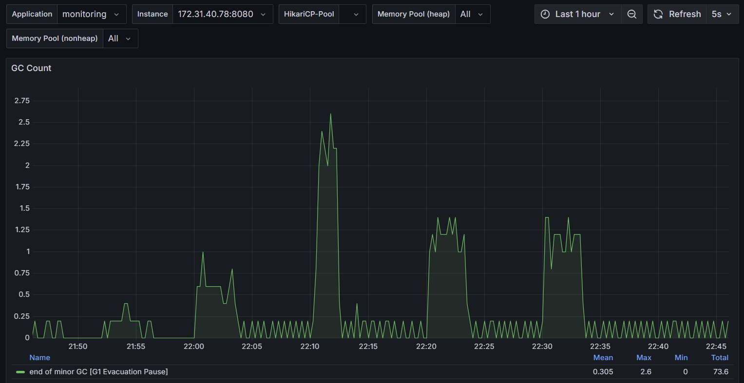 해당 GC Count 지표에서도 GC로 인한 Stop-the-world 지연이 거의 없었고 괜찮은 처리 속도를 유지했기 때문에