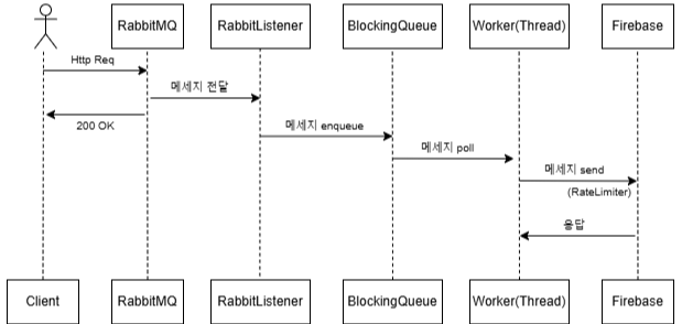 - @RabbitListener는 메시지를 Firebase로 직접 보내지 않고 내부 BlockingQueue에 넣어줌