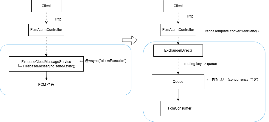 하지만 요청이 한 번에 몰리면 FCM 전송 병목이 발생할 수 있다는 문제점이 있어